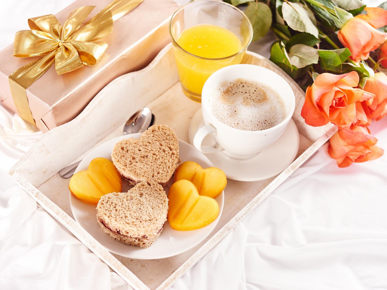 Wallpaper Breakfast for your beloved with a bouquet of roses and a gift