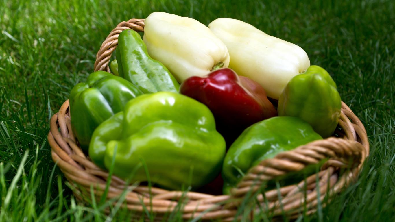 Wallpaper Multicolored sweet pepper in a basket stands on green grass