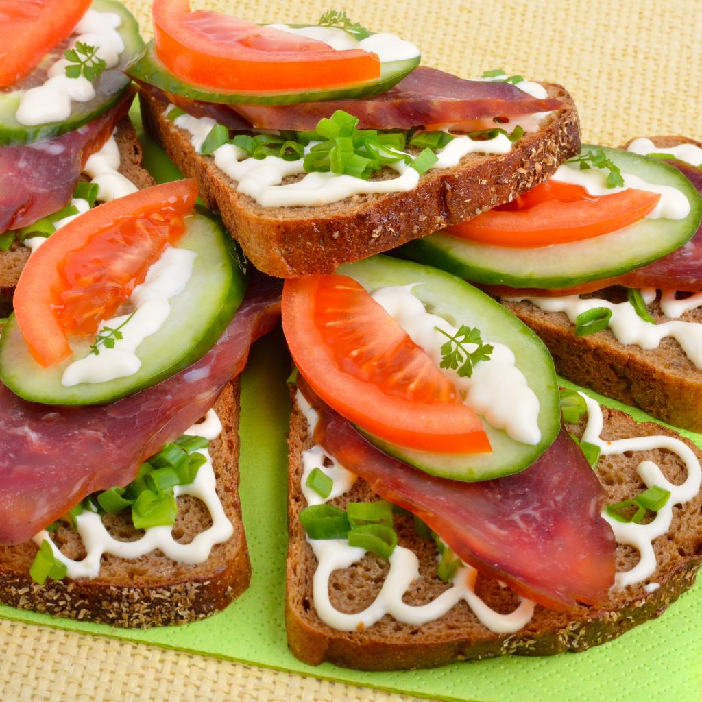 Wallpaper Appetizing sandwiches with sausage, tomatoes and cucumbers