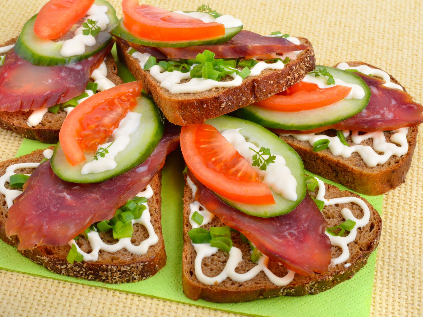 Wallpaper Appetizing sandwiches with sausage, tomatoes and cucumbers