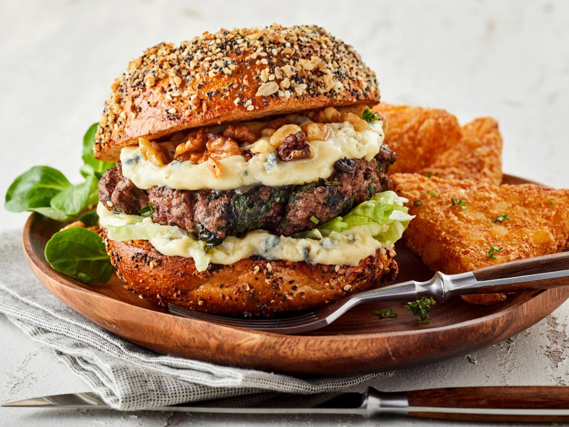 Wallpaper Appetizing hamburger on a wooden plate