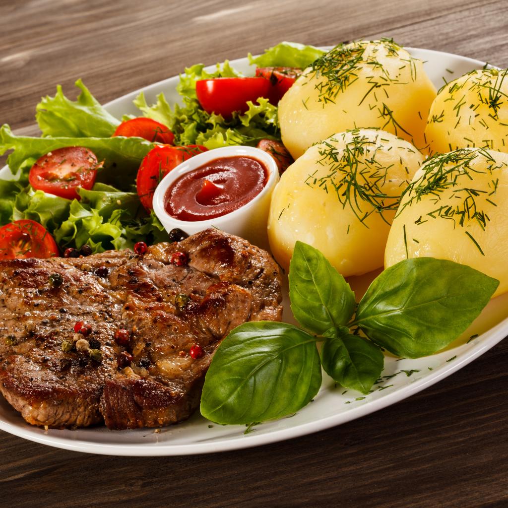 Wallpaper Boiled potatoes with a piece of meat and a salad on a plate
