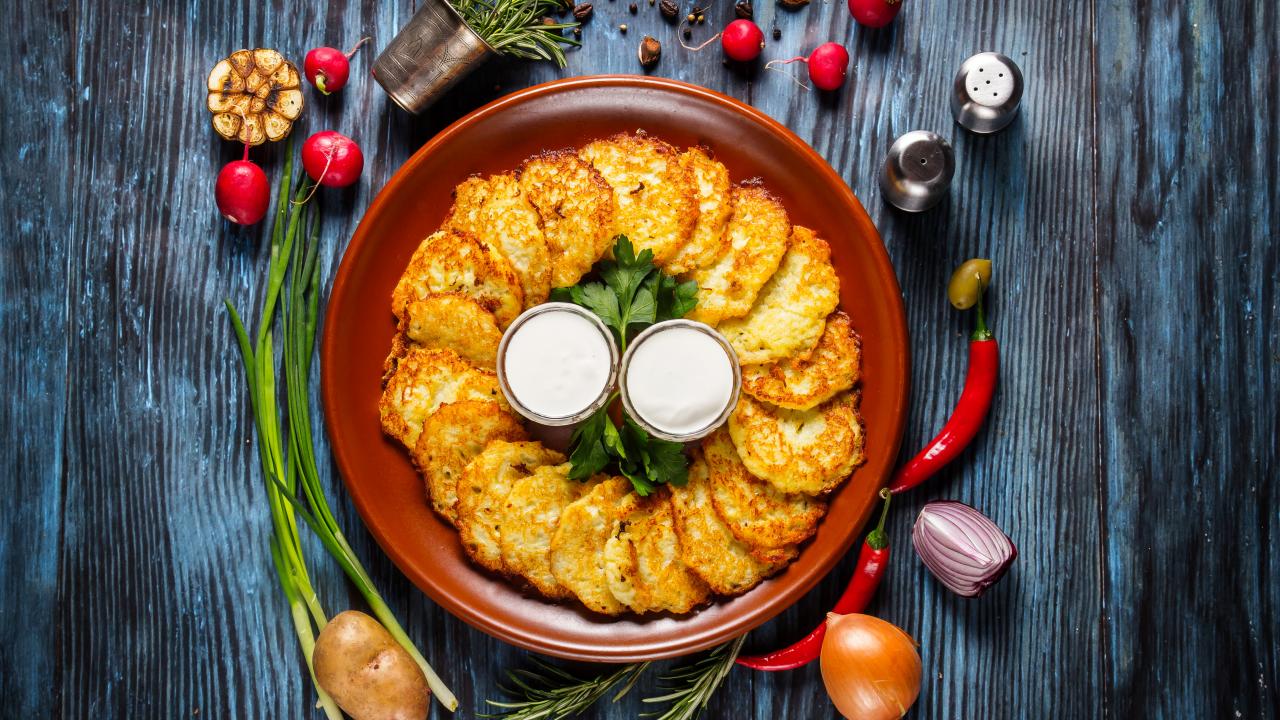 Wallpaper Draniki with sauce on a plate on a table with vegetables