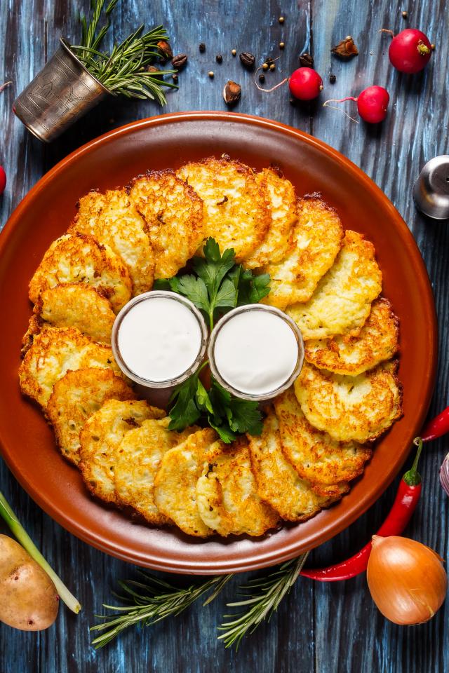Wallpaper Draniki with sauce on a plate on a table with vegetables
