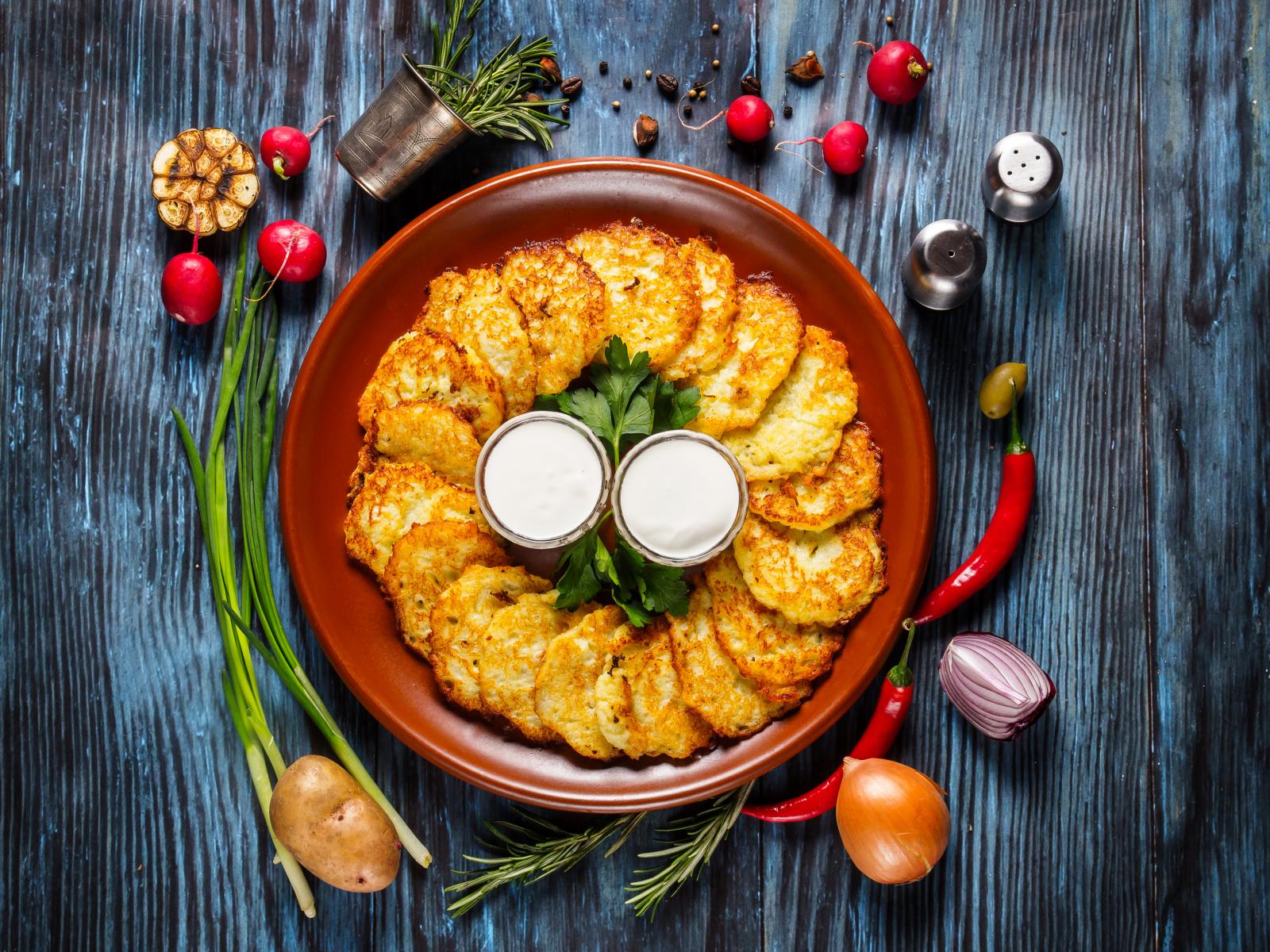 Wallpaper Draniki with sauce on a plate on a table with vegetables