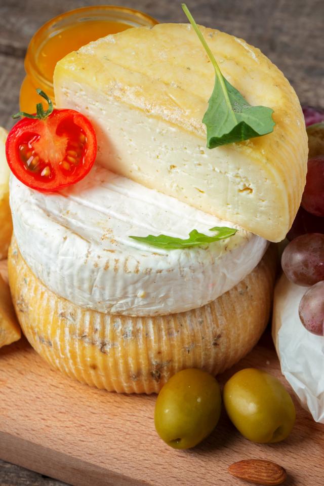 Wallpaper Cheese on a cutting board with grapes and olives