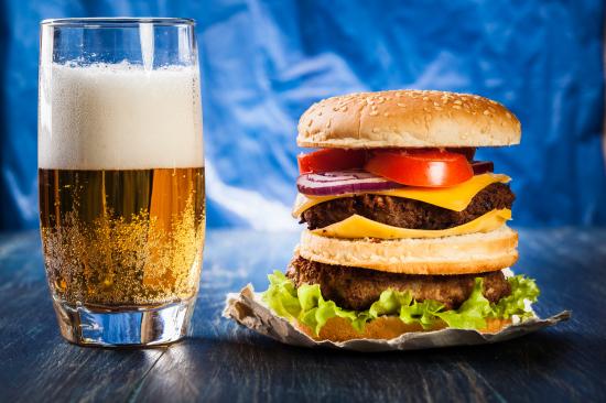 Wallpaper A glass of beer with a hamburger on the table