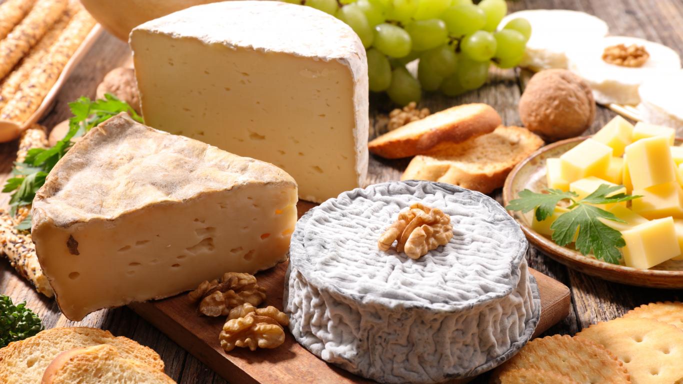 Wallpaper Cheese with mold on the table with grapes, nuts and bread