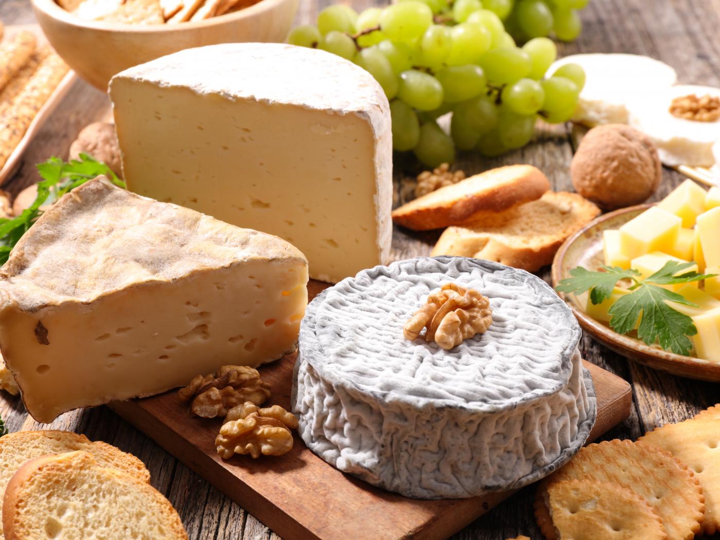 Wallpaper Cheese with mold on the table with grapes, nuts and bread