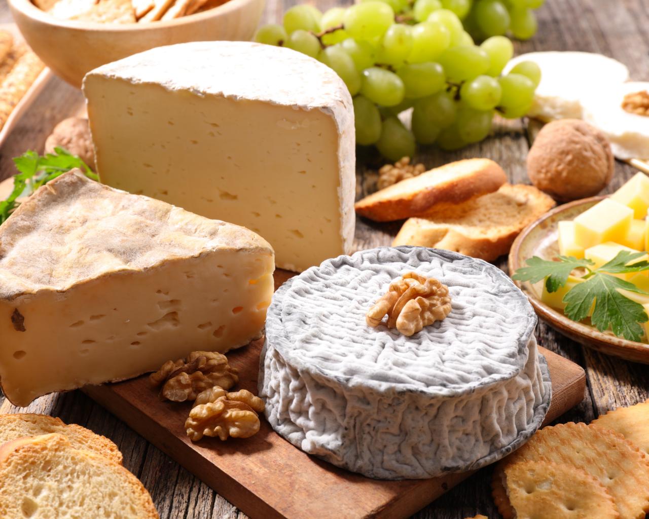 Wallpaper Cheese with mold on the table with grapes, nuts and bread