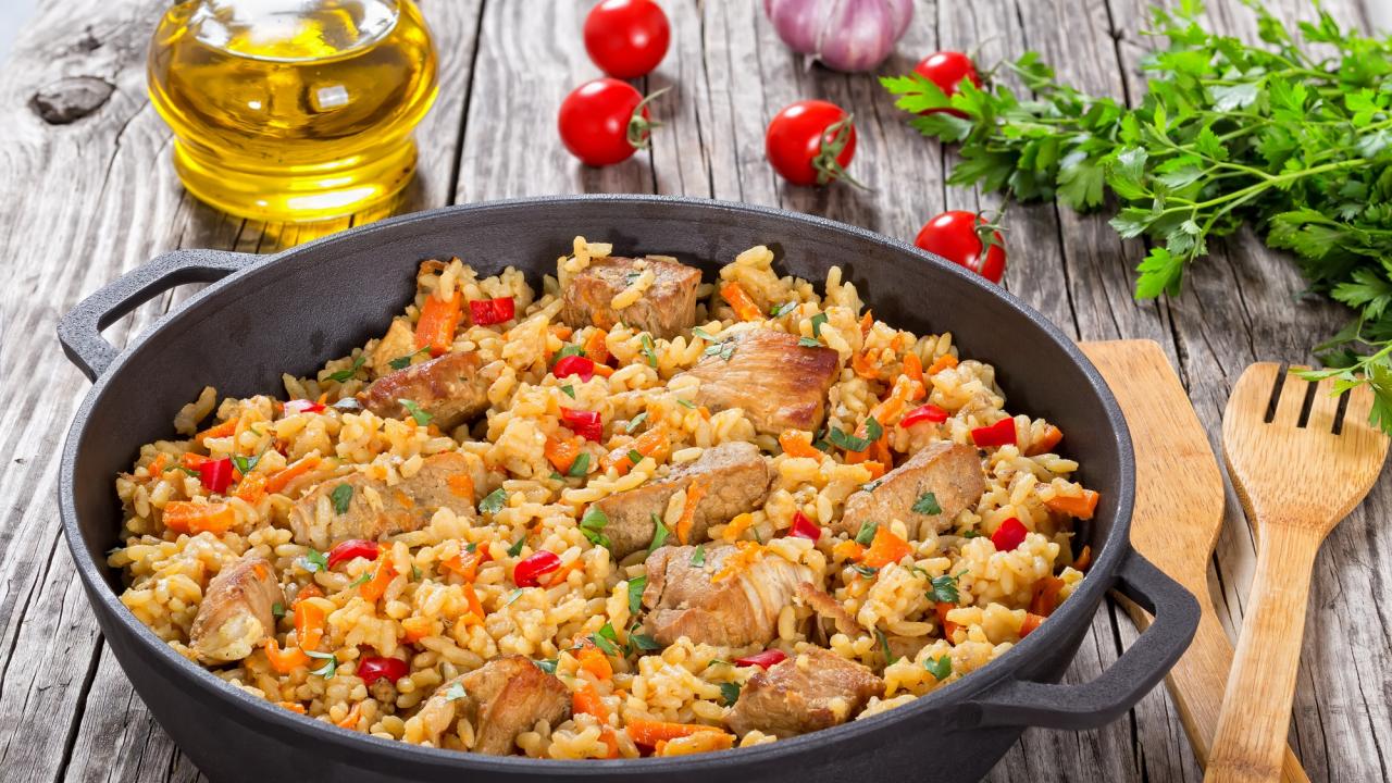 Wallpaper Pilaf with meat on a table with tomatoes and parsley