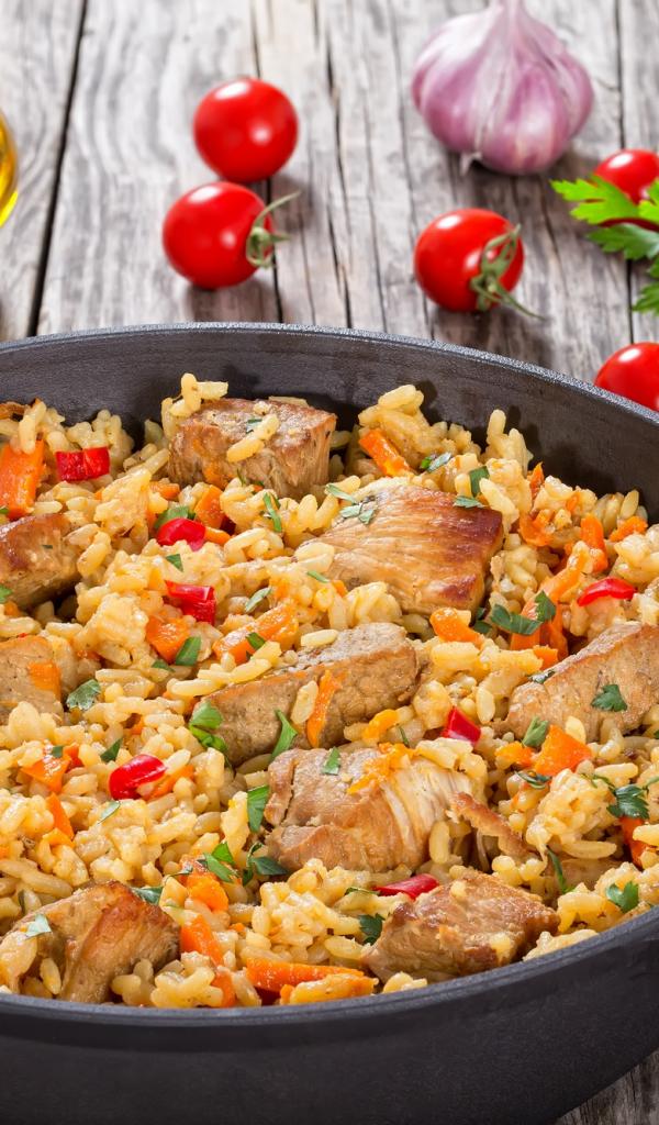 Wallpaper Pilaf with meat on a table with tomatoes and parsley