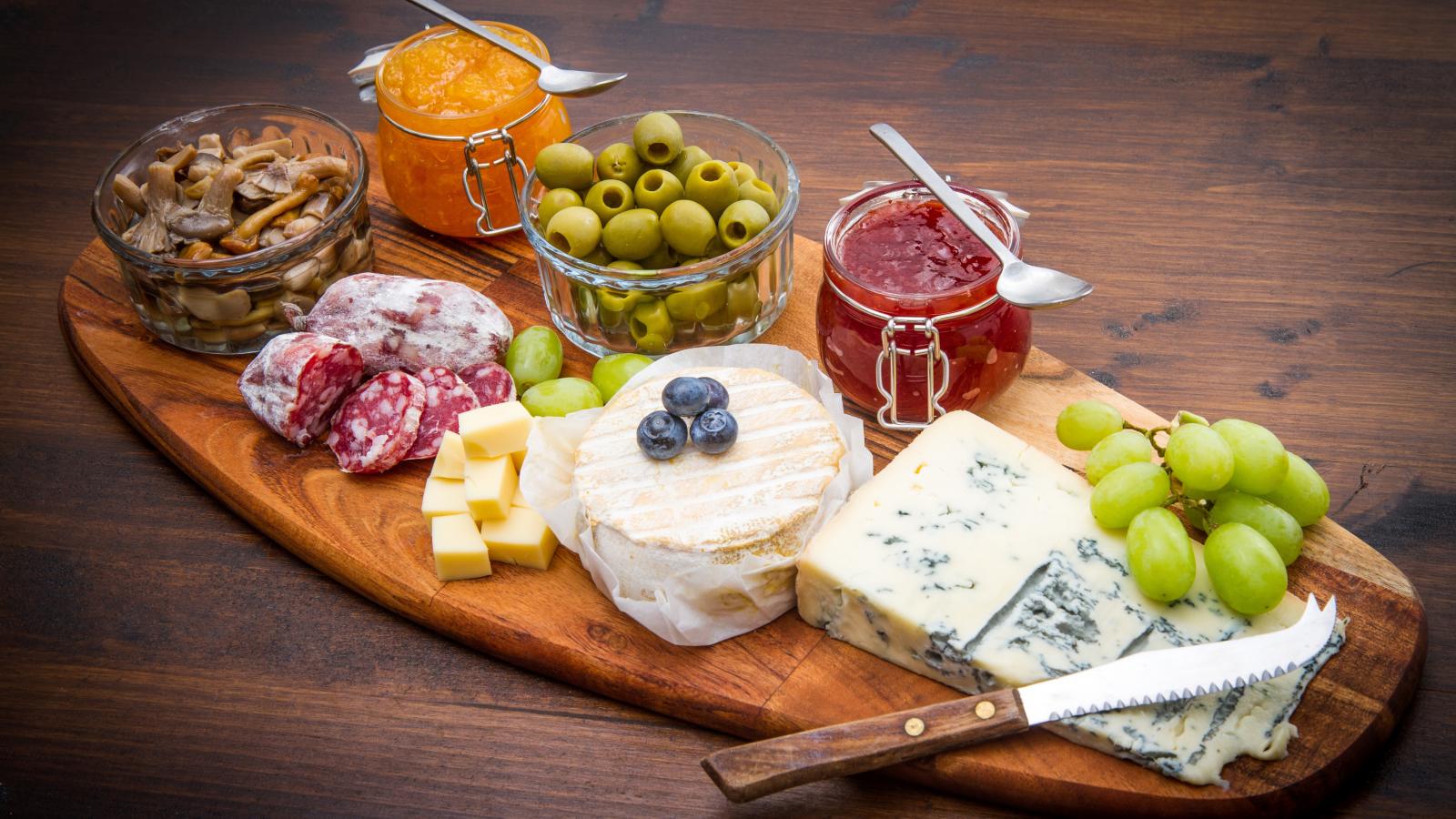 Wallpaper Cheese, mushrooms, olives, sausage, grapes and jam on a cutting board