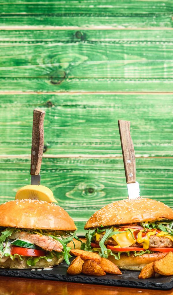 Wallpaper Hamburgers with knives on a wooden background
