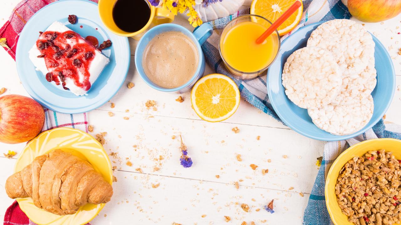 Wallpaper Appetizing breakfast in bed with alarm clock