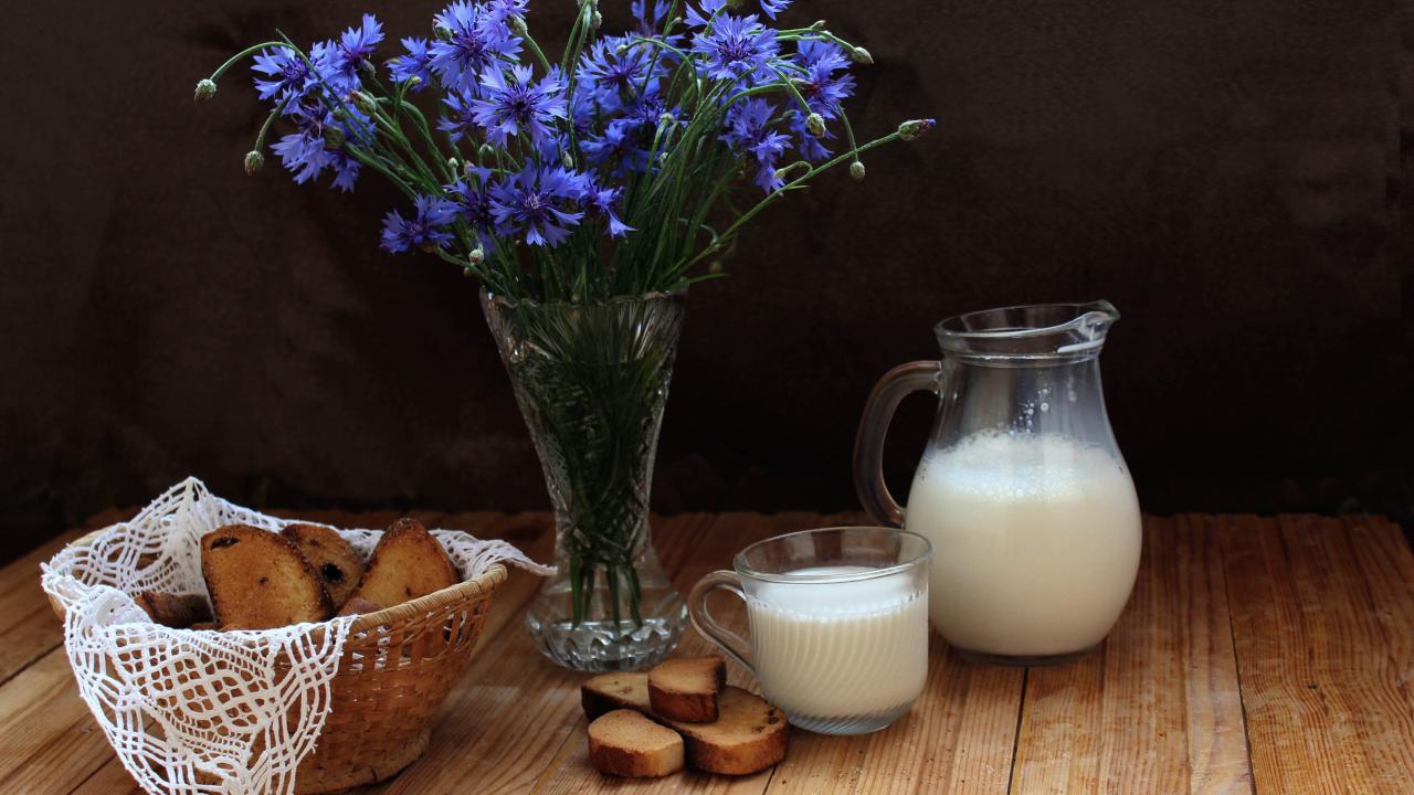 Wallpaper Milk with croutons on a table with a bouquet of blue cornflowers