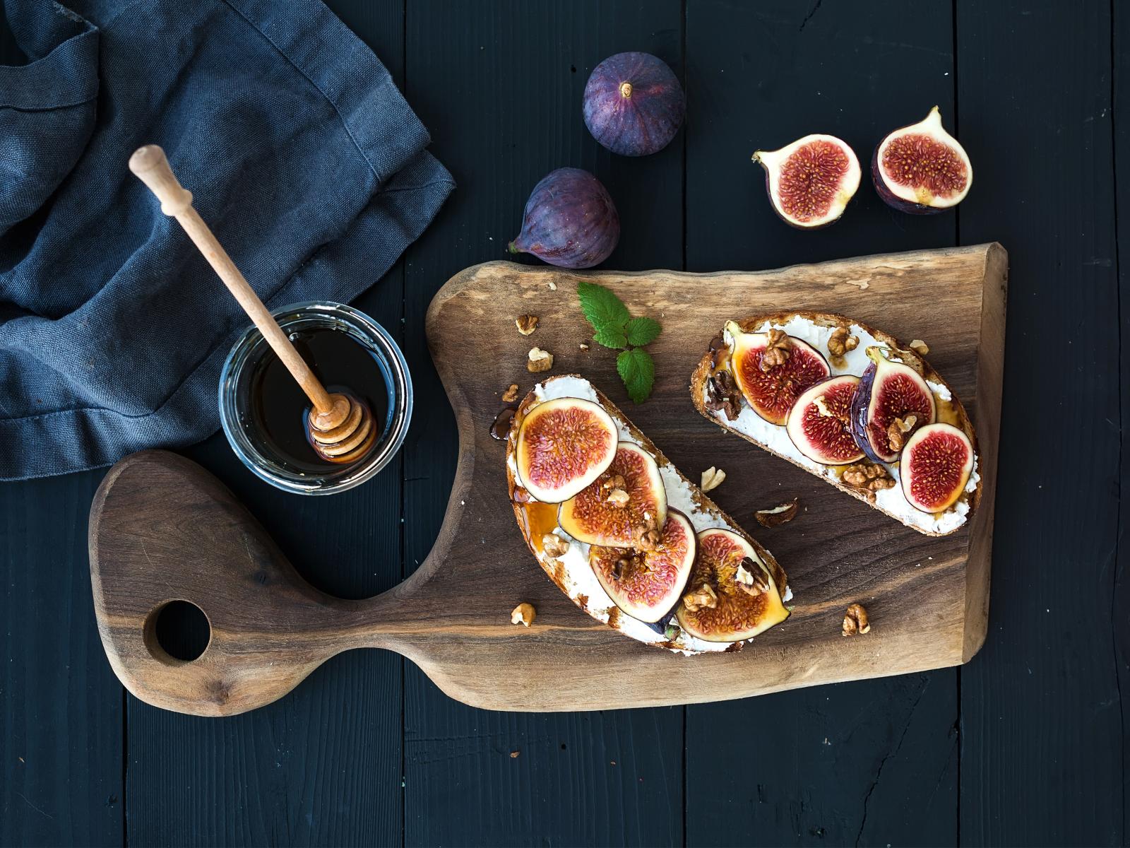Wallpaper Sandwiches with figs on a cutting board with honey