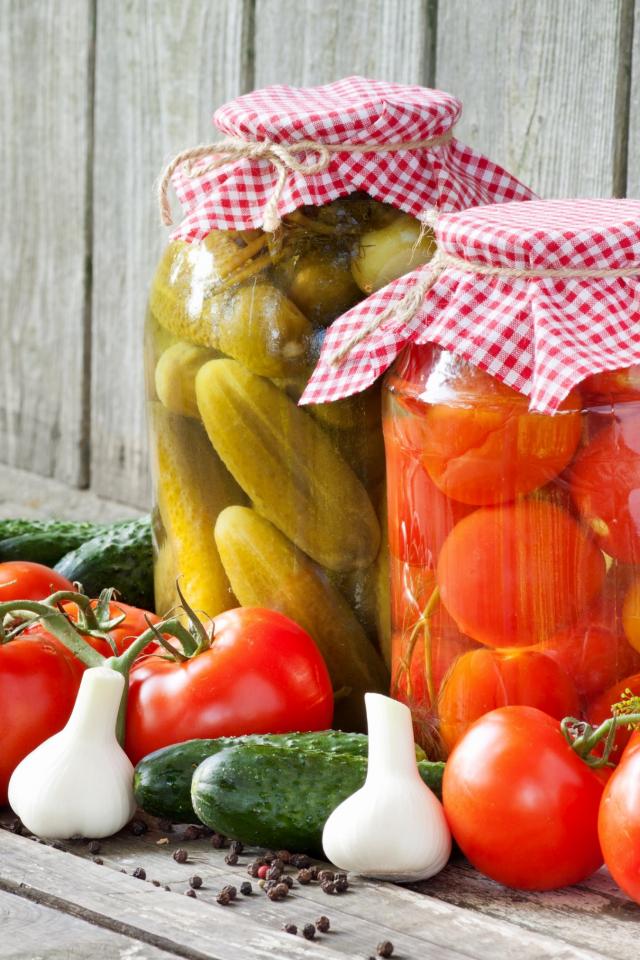 Wallpaper Pickles of cucumbers and tomatoes with vegetables on the table