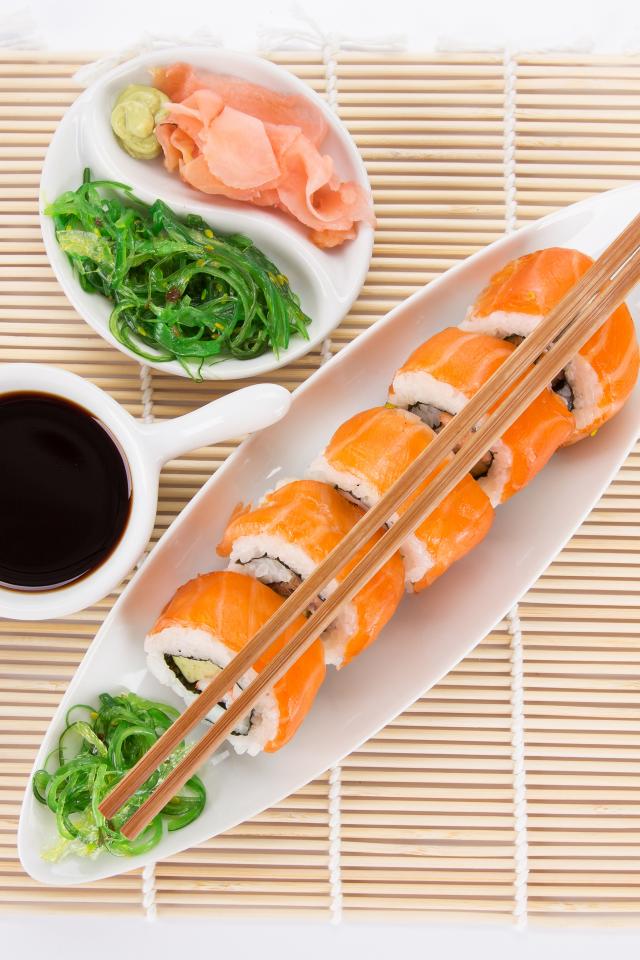 » Wallpaper Japanese sushi on a table with soy sauce and ginger with salad