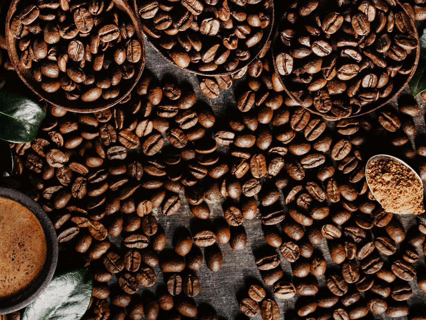 Wallpaper Glasses with coffee, coffee beans and ground coffee on a table with sugar cubes