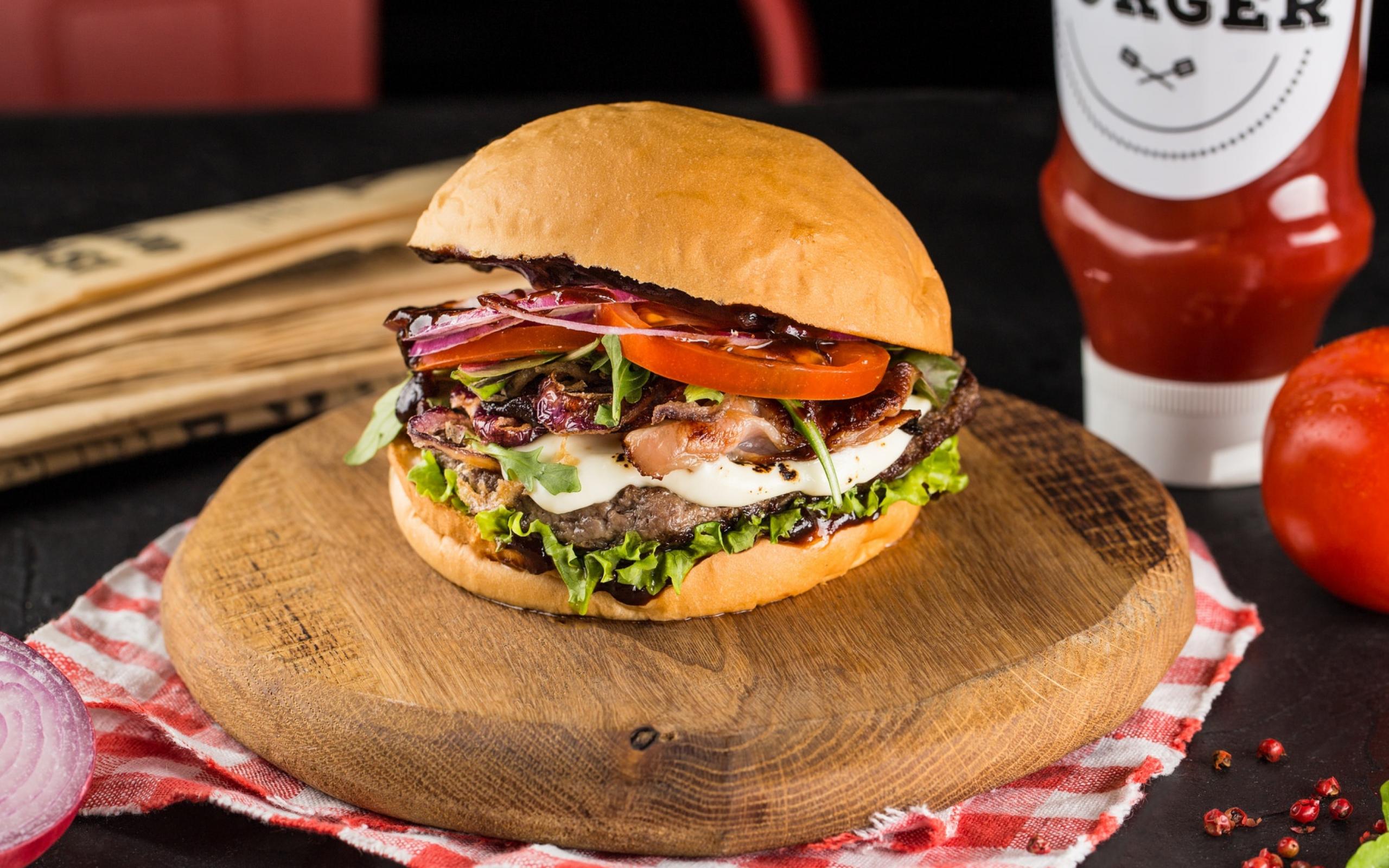 Wallpaper Large appetizing hamburger on a wooden board