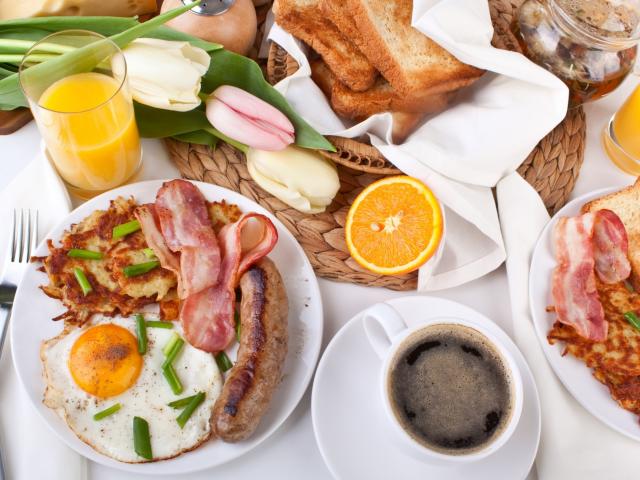 Wallpaper A hearty breakfast on the table with a bouquet of tulips