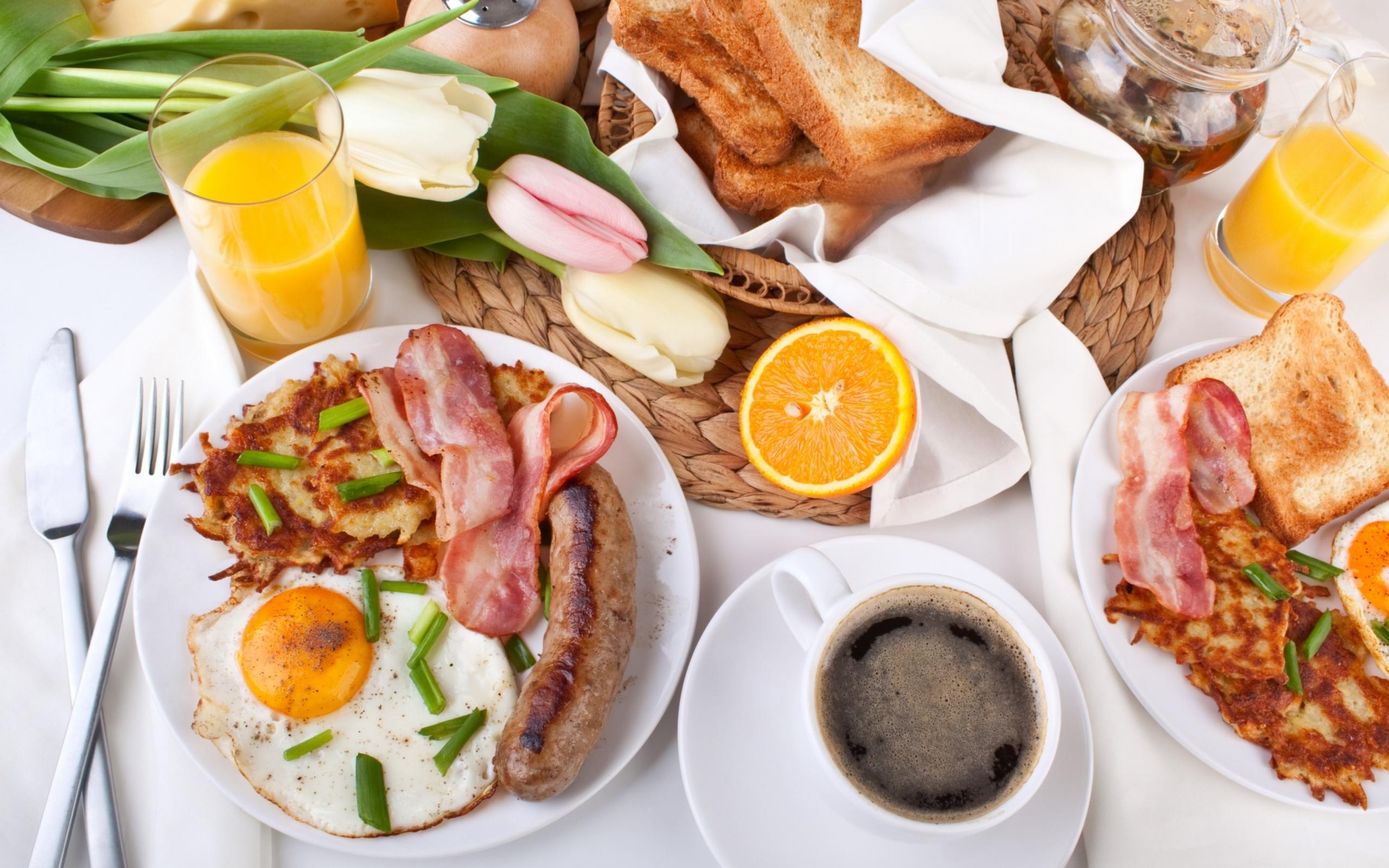 Wallpaper A hearty breakfast on the table with a bouquet of tulips