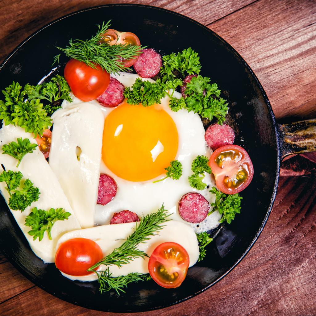 Wallpaper Scrambled eggs with sausage, cheese, tomatoes and greens in a frying pan