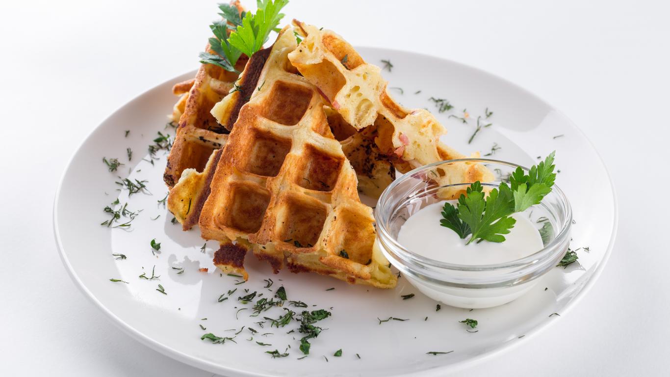 Wallpaper Unsweetened waffles on a white plate with greens and sauce