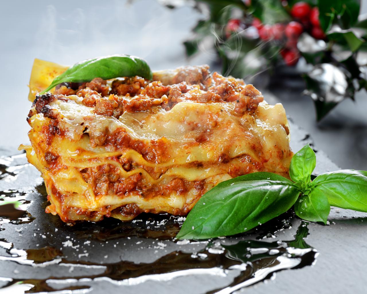 Wallpaper Appetizing hot lasagna with basil on the table