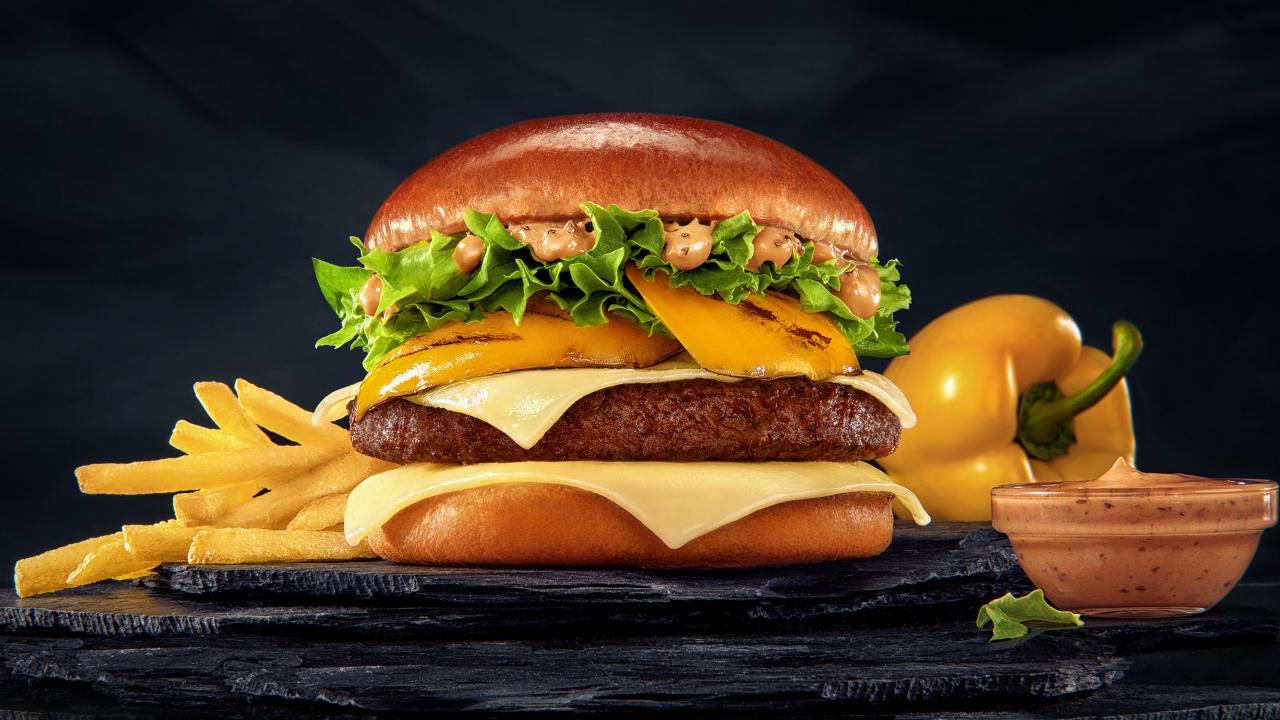 Wallpaper Appetizing hamburger with French fries, bell pepper and sauce