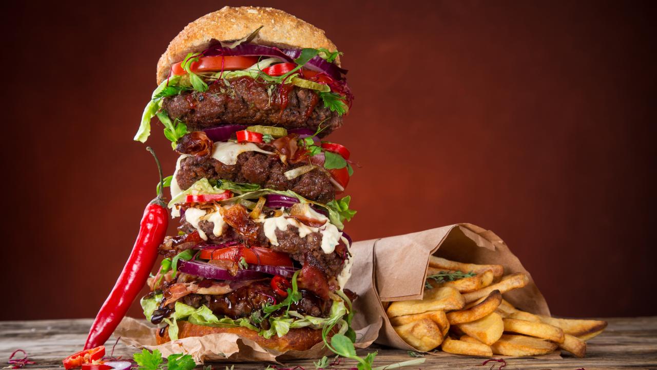 Wallpaper A huge hamburger on the table with French fries and hot peppers