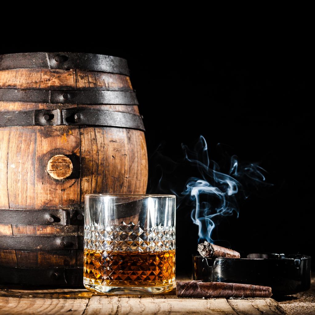 Wallpaper A keg of rum, with a glass of whiskey and a cigar on a black background