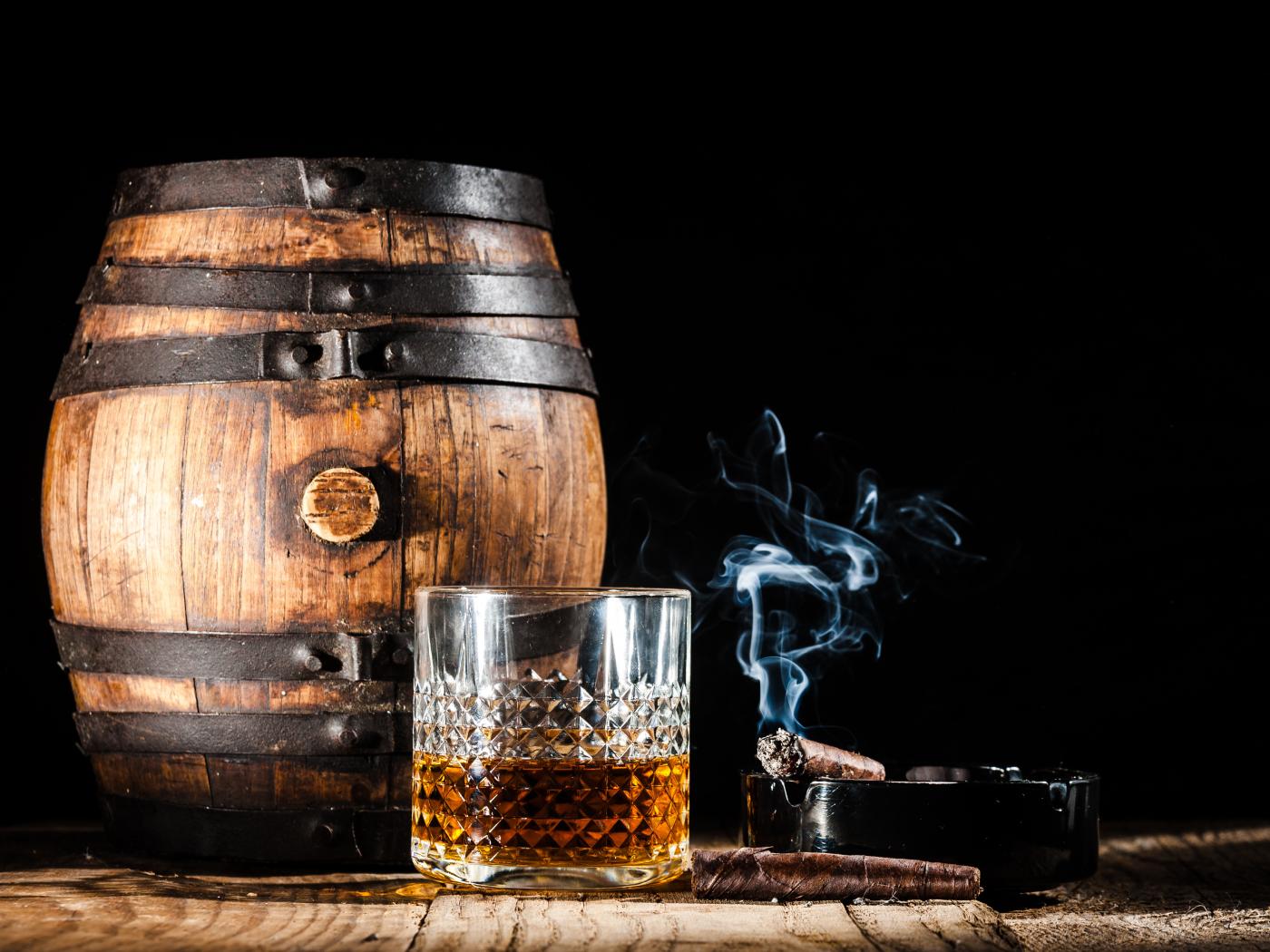 Wallpaper A keg of rum, with a glass of whiskey and a cigar on a black background