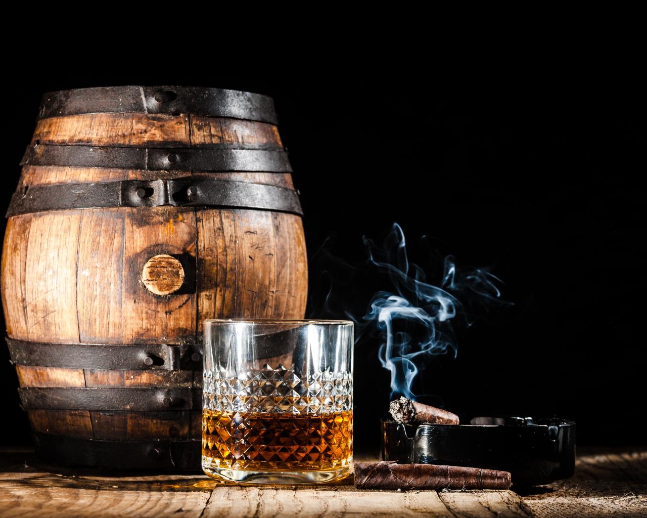 Wallpaper A keg of rum, with a glass of whiskey and a cigar on a black background