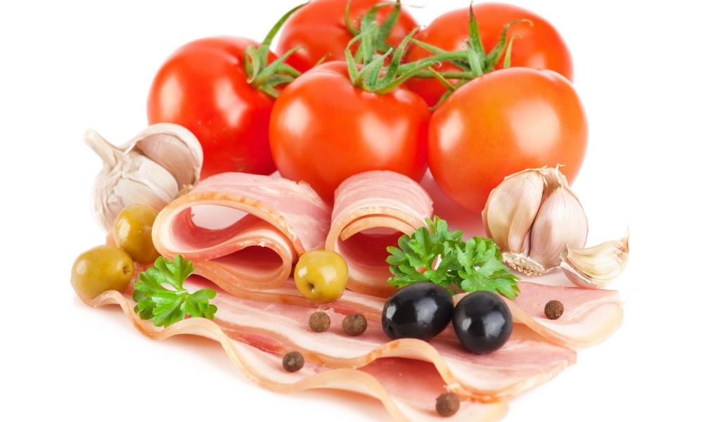 Wallpaper Ripe red tomatoes with bacon, garlic and olives on white background