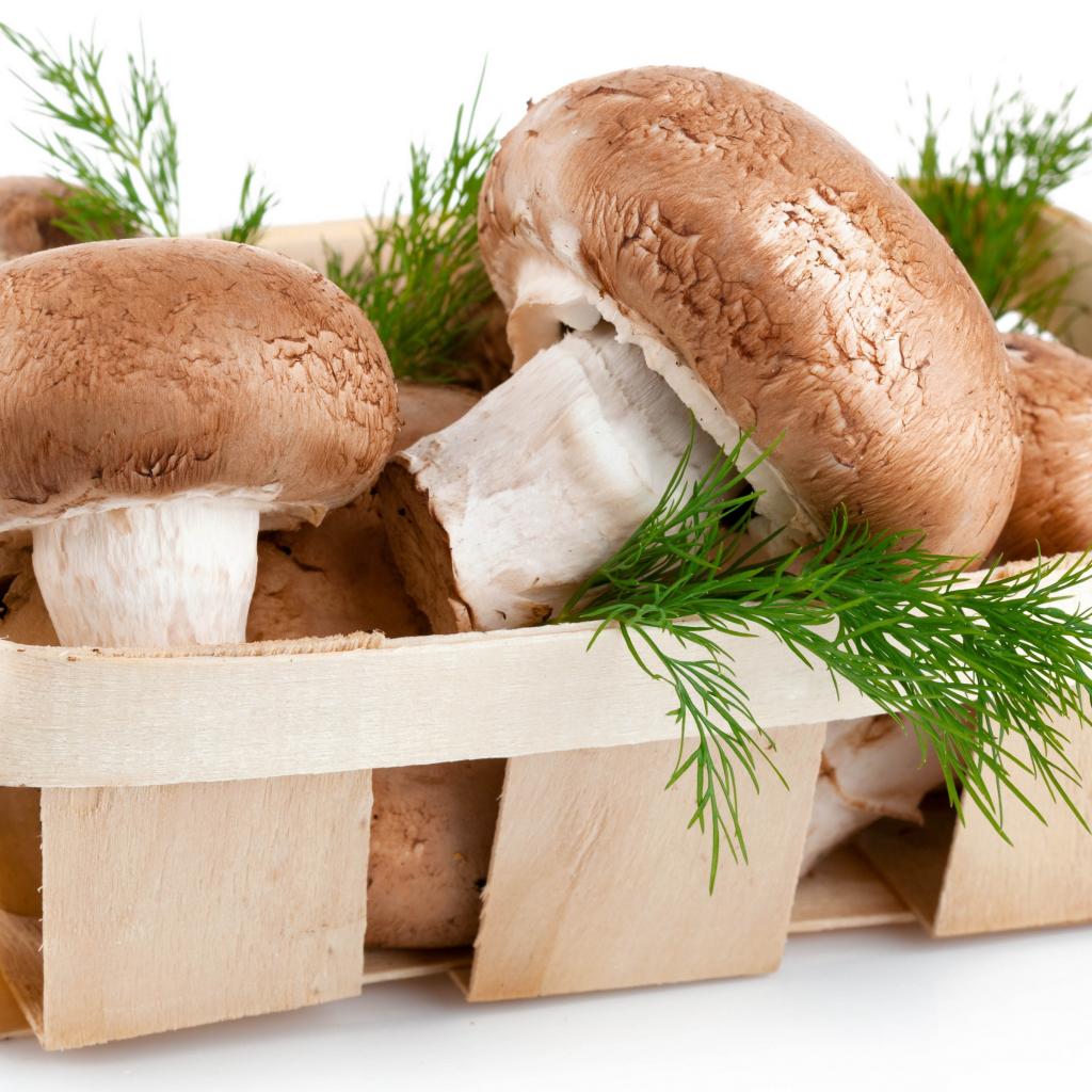 Wallpaper Champignon mushrooms in a wooden basket with dill on a white background