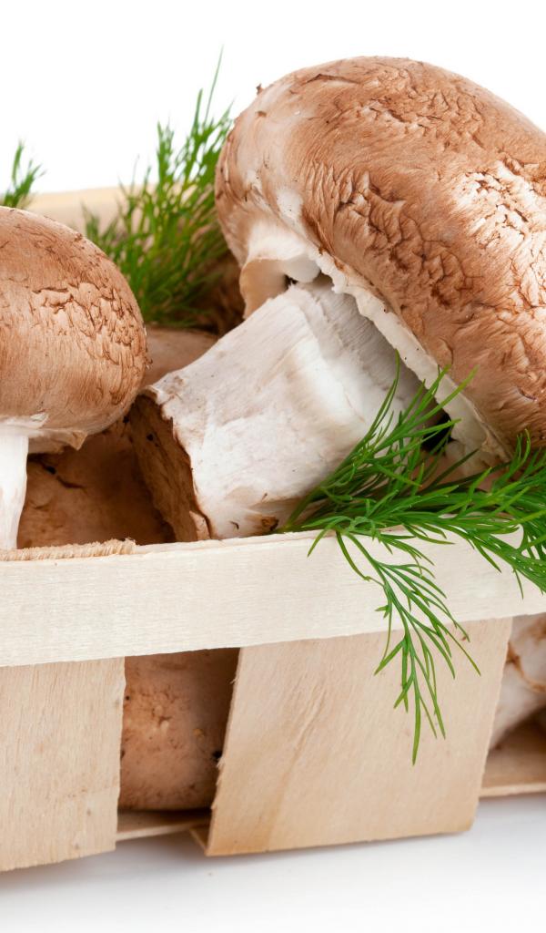 Wallpaper Champignon mushrooms in a wooden basket with dill on a white background