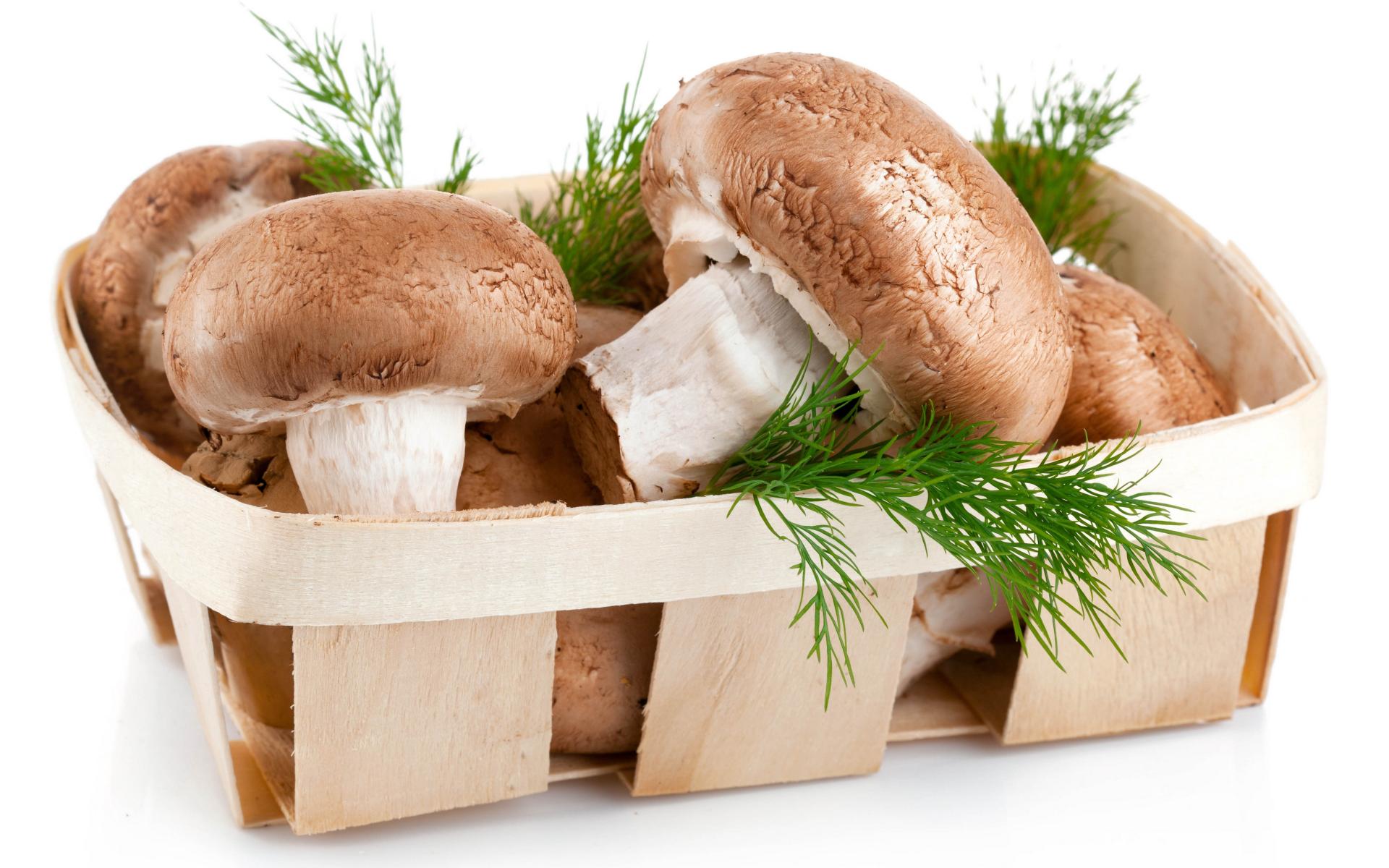 Wallpaper Champignon mushrooms in a wooden basket with dill on a white background