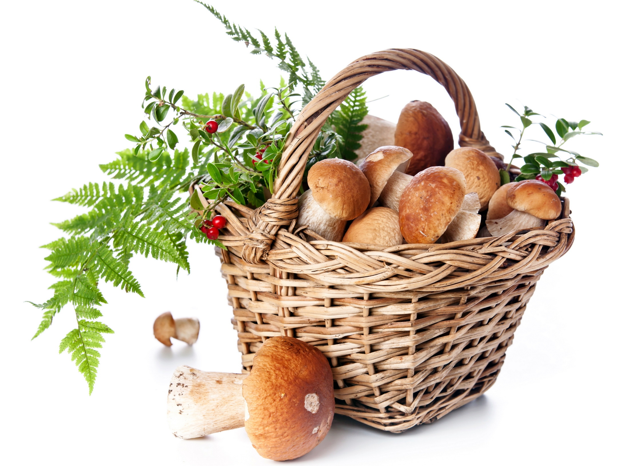 Wallpaper Big basket of mushrooms with berries on a white background