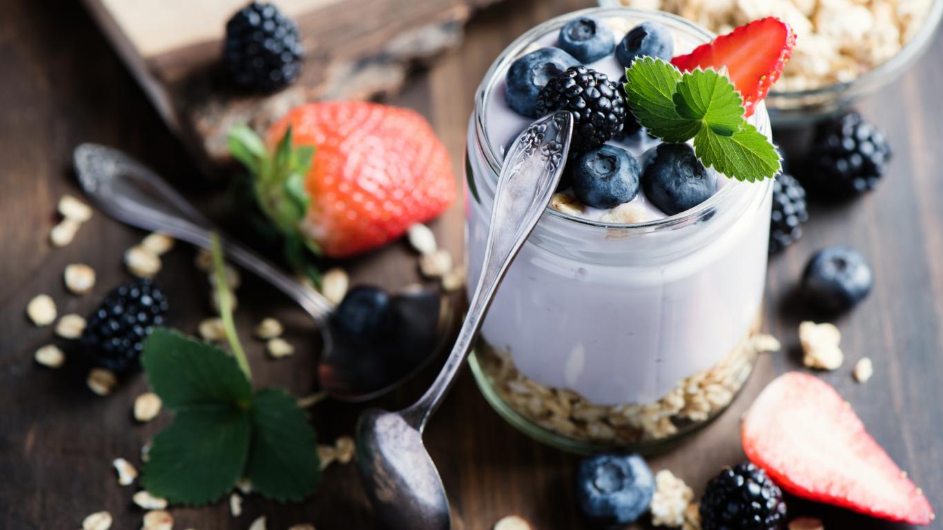 Wallpaper A jar of cereal, yogurt and berries on the table with spoons