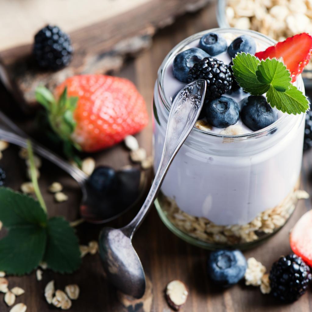 Wallpaper A jar of cereal, yogurt and berries on the table with spoons