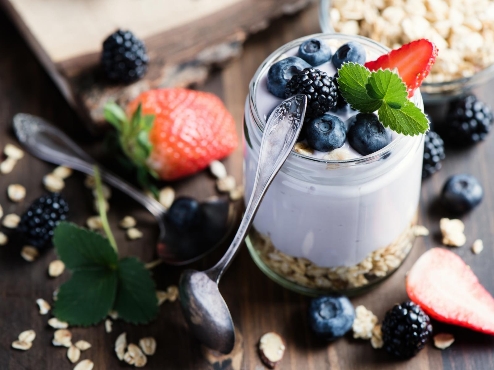 Wallpaper A jar of cereal, yogurt and berries on the table with spoons