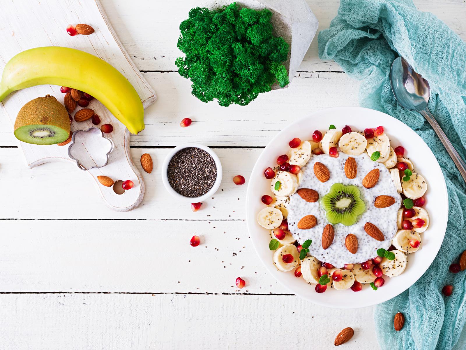 Wallpaper Dessert with bananas, pomegranates and almonds