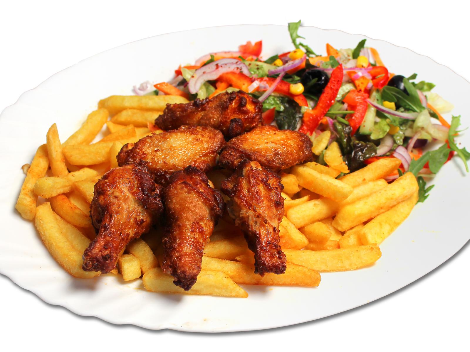 Wallpaper French fries with fried chicken and salad on a white plate