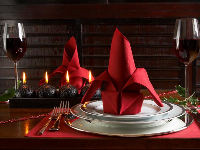 Wallpaper Red napkin on a plate on the table with glasses of wine and candles