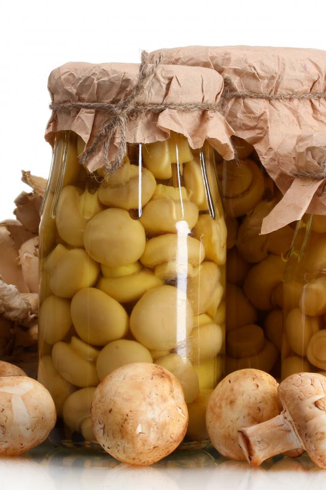 Wallpaper Marinated champignons in jars on white background with fresh
