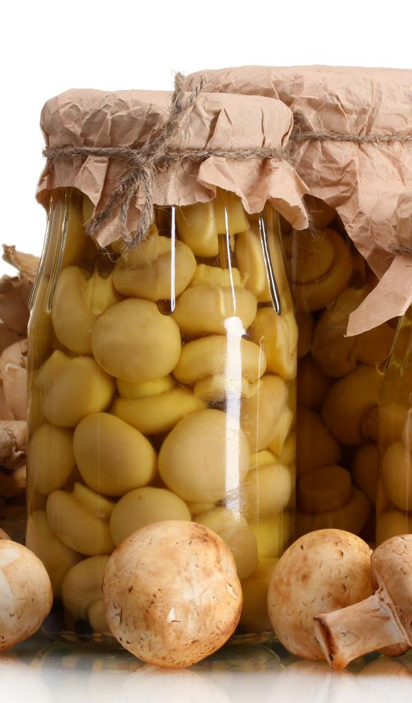 Wallpaper Marinated champignons in jars on white background with fresh