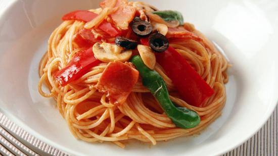 Wallpaper Spaghetti with Bulgarian pepper, bacon and mushrooms