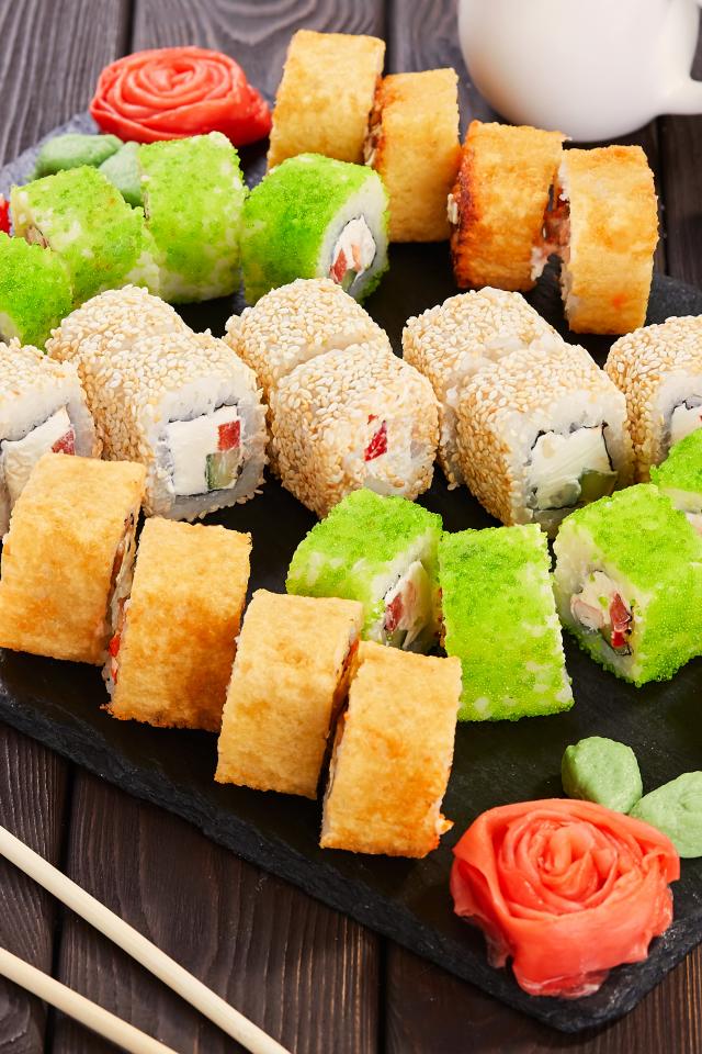 Wallpaper Japanese rolls on the table with chopsticks and soy sauce